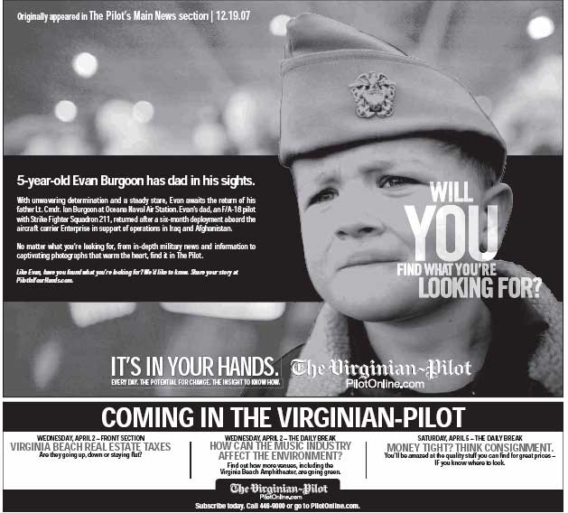 Rewind to the day the photo was taken. Ah, the day of the fly in. Ian was away 18 of 24 months. That is a staggering amount of time. As a family we were pushed to the edge with such a separation. I need not detail how it all effected me - that is all here in my blog. See the entry about DEPRESSION, ANGST, MISERY. But the fly in finally marked the end. We were soooo excited. It was just a couple of days before Christmas. I wore a brand new silk dress. Evan wore his mini flight suit and flight jacket. We even dug out one of Ian's old covers to complete the look. I brought my camera but was so giddy I could barely remember how to use it! My shot of the low formation of jets that flew overhead is white because I forgot to change my exposure. But it was okay. There was plenty of press to get the shots, right? And, naturally Evan was the media darling in his flight suit, flight jacket, brown boots, and cover. Rich-Joseph Facon, a VERY TALENTED photographer for the Virginian Pilot spent most of the 45 minutes from the fly over to the taxiing in to the run-as-fast-as-you-can-and-tackle-your-hubby-moment attempting to get the perfect shot of my dear son, Evan. Of course, Evan was sooooo on to him, being the son of a photographer, and was not fooled. He hid under his sign and just giggled at how difficult he was being. So happy to not be yelled at by mom for dodging the camera. But Facun was not phased and enjoyed being goofy with Evan. He was determined. He must have taken 100 photos of Evan alone that day. And, when he stepped back and waited, this photo presented itself. It has made him famous. It was the front page of the paper the next day. It was selected as photo of the month, one of the top photos of 2007 for the Pilot. He won international award for it. People all around the world have seen it. My kid is a poster child for military kids. And, now it is an ad campaign.
